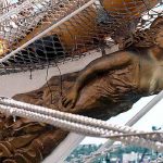 Protected by waist high bulkheads painted green on the inside, the PATRICK HENRY and ships of its class had clear decks save for “the stern where, wheel in hand and binnacle containing the compass before him, stands the helmsman. Forward are two hatches for cargo with the ship’s boat on top. Around the boat stand our future meals—a milk cow, pigs, ducks, hens and sheep!